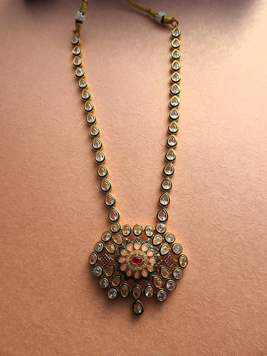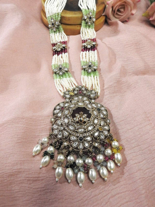 Multi-Layer Beaded Polki Necklace Set with Floral Centerpiece