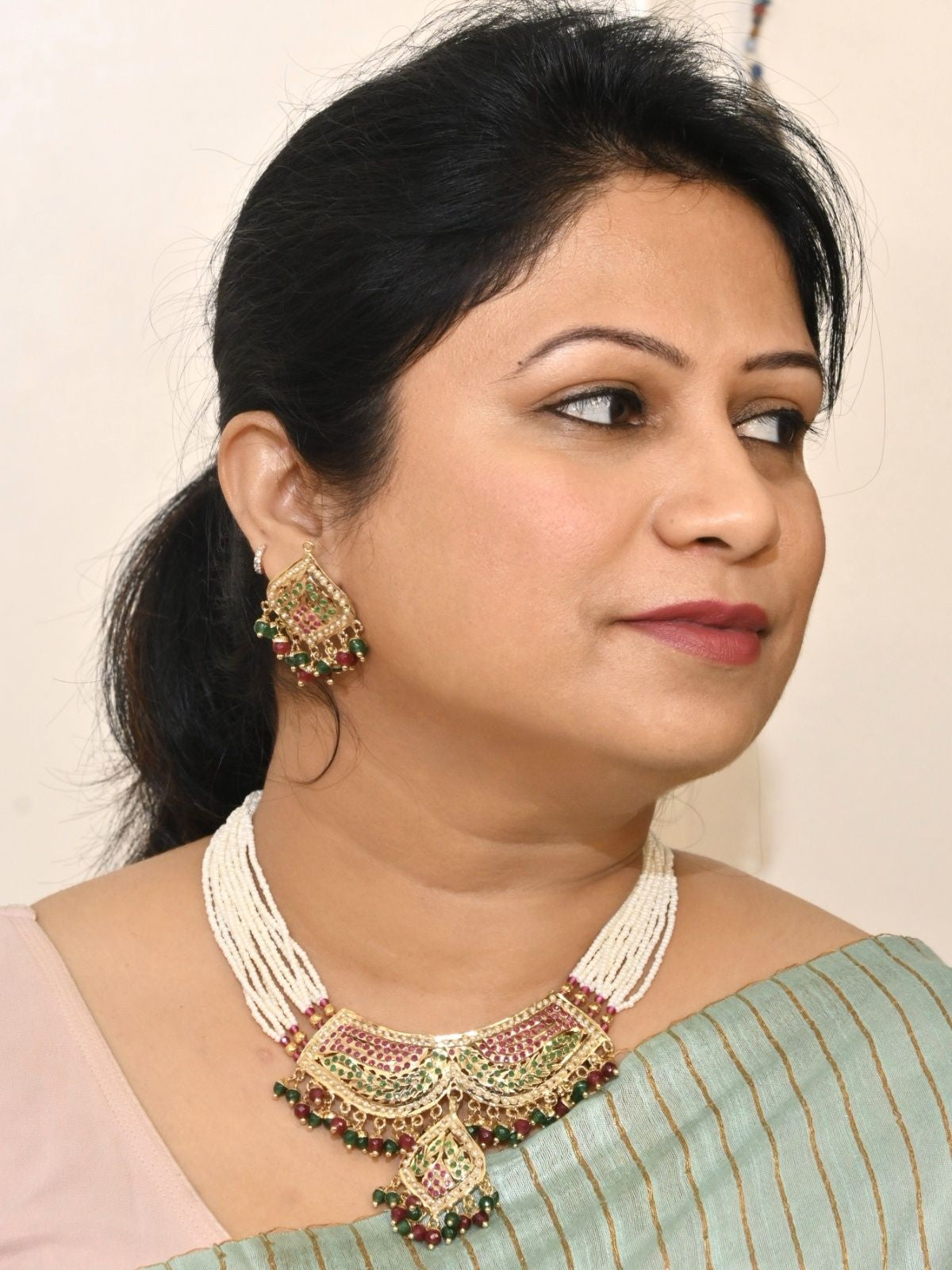 The layered pearl drape sits beautifully on the neckline while coloured stones add a refined heritage touch. Complete with matching earrings, this set instantly elevates any traditional or Indo-ethnic outfit.