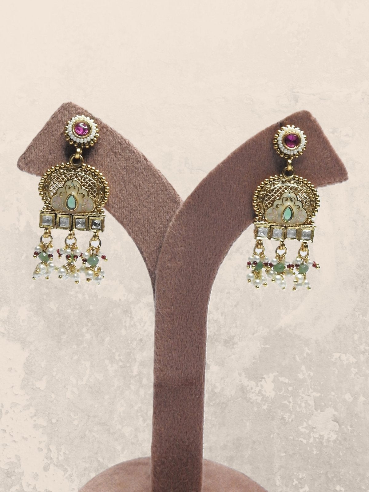 The Pearl Majesty Necklace Set embodies regal grace with a modern touch. Designed with layered pearl strands, antique gold detailing and ruby green accents, this statement long necklace brings an elegant royal charm to festive and wedding looks.