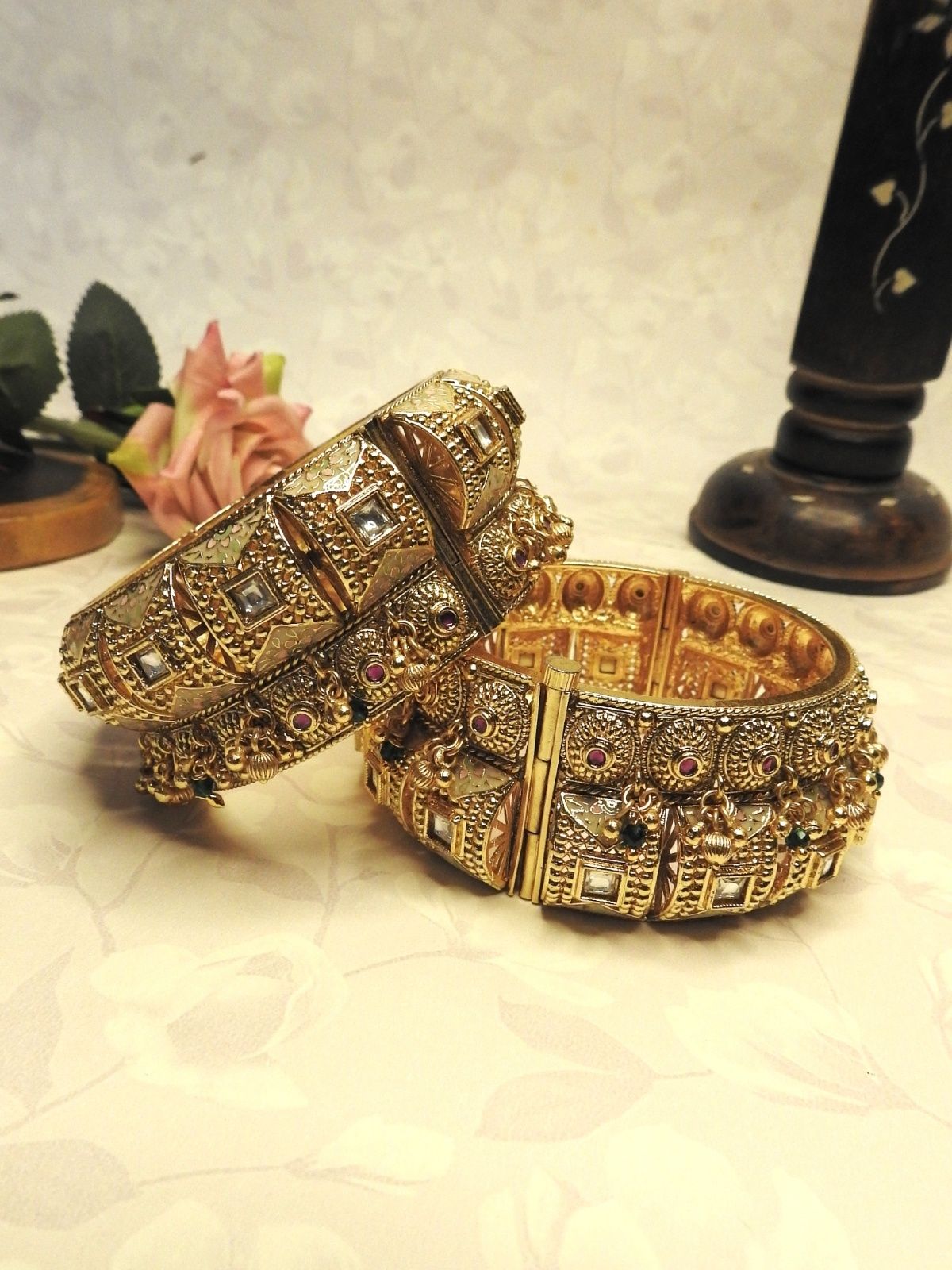 Designed with intricate antique gold detailing, mirror-style stones and delicate hanging charms, this bangle set captures the essence of classic royal elegance. Its rich design and fine craftsmanship make it perfect for weddings, festive occasions and traditional celebrations.