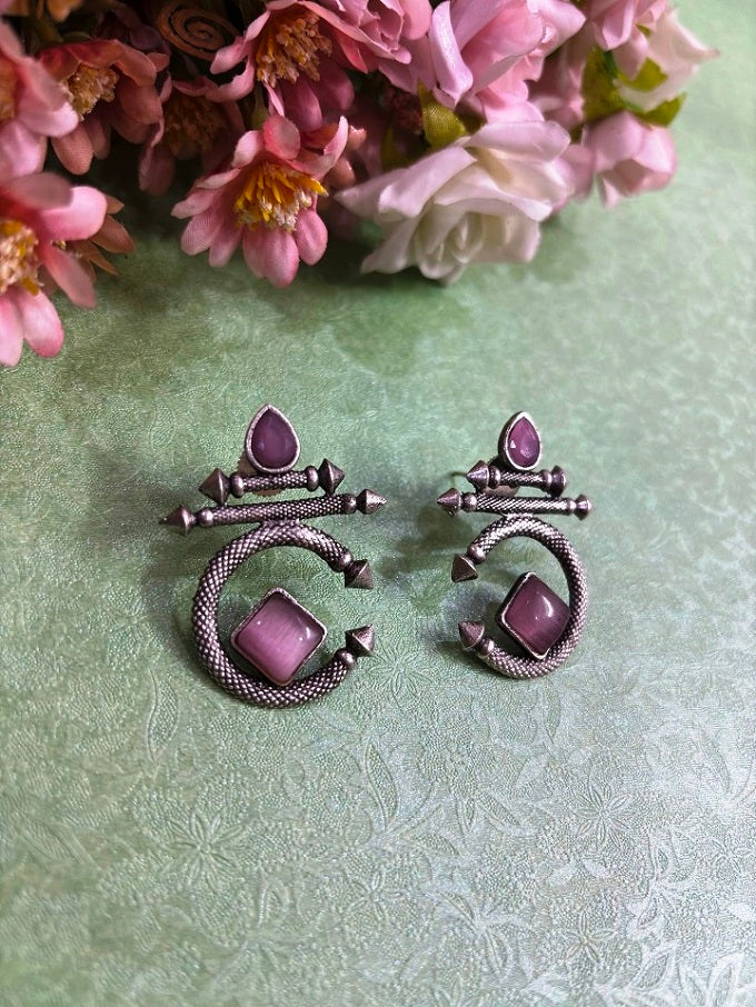 Turn heads with this pair of tribal-inspired oxidized silver earrings, intricately crafted in a bold circular coil design. Featuring textured detailing and arrowhead ends, the design adds an edge of warrior-like grace. The earrings are adorned with a square stone at the center, beautifully complemented by a matching teardrop stud at the top.