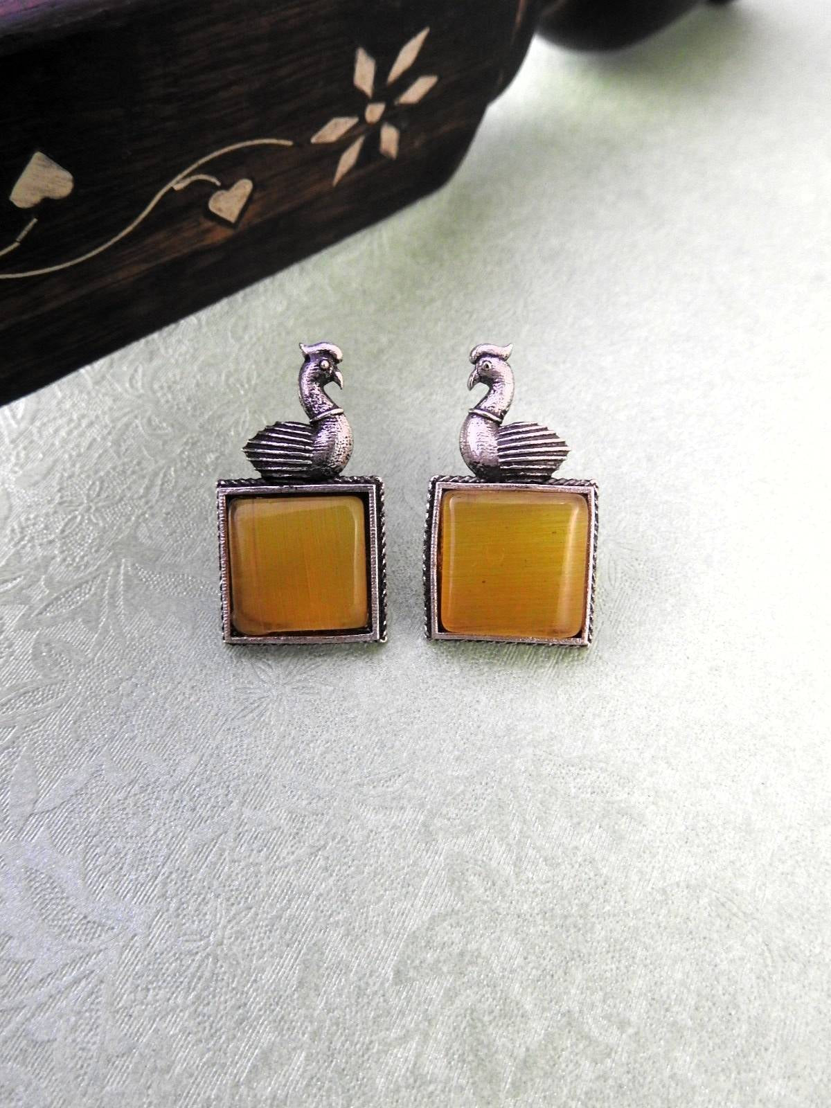 Add a touch of vintage charm to your look with these exquisite oxidised stud earrings. Featuring a beautifully crafted swan motif on top of a bold rectangular stone, these earrings blend traditional artistry with modern elegance. The intricate detailing gives them a timeless appeal, making them perfect for both festive and everyday wear. Lightweight and versatile, they pair effortlessly with ethnic and contemporary outfits alike.