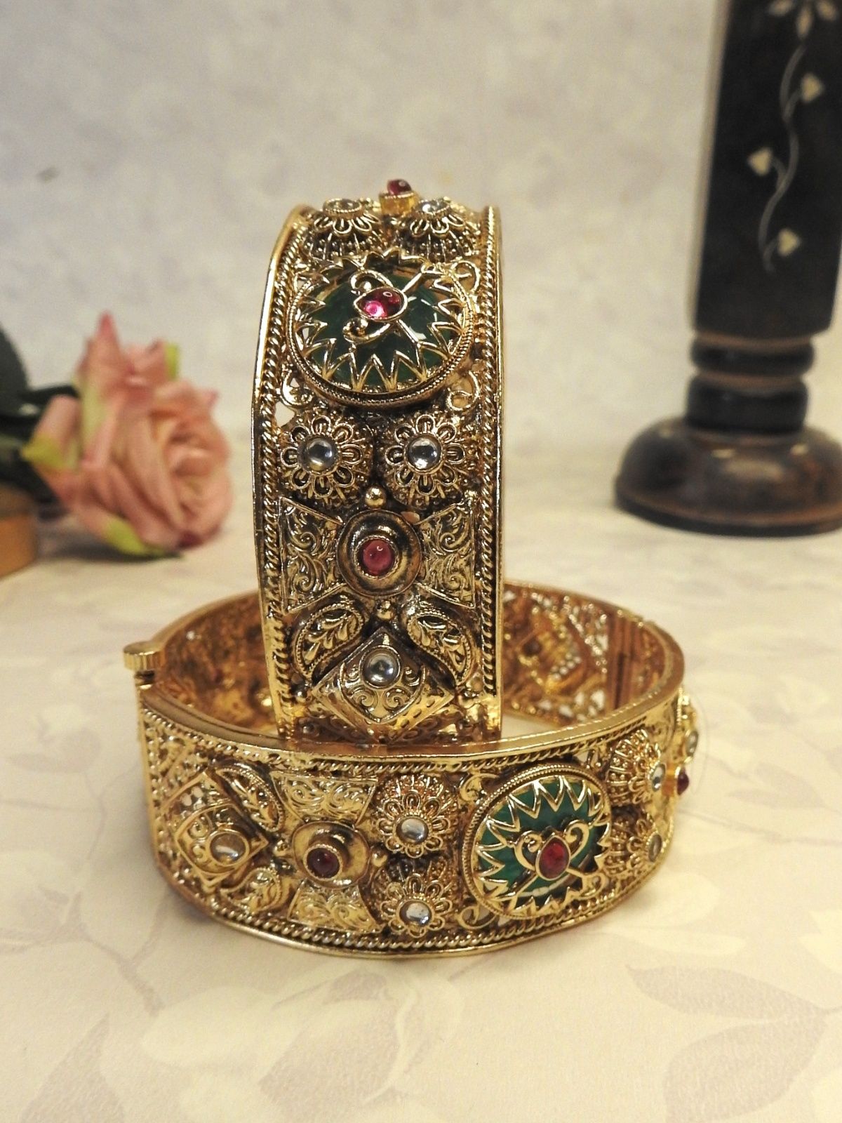 Beautifully handcrafted in an antique gold finish, this bangle set features intricate floral detailing, ruby accents and rich green enamel highlights. Designed for the modern woman who loves timeless luxury, it blends traditional artistry with a refined contemporary touch, perfect for weddings, festive occasions or evening celebrations.