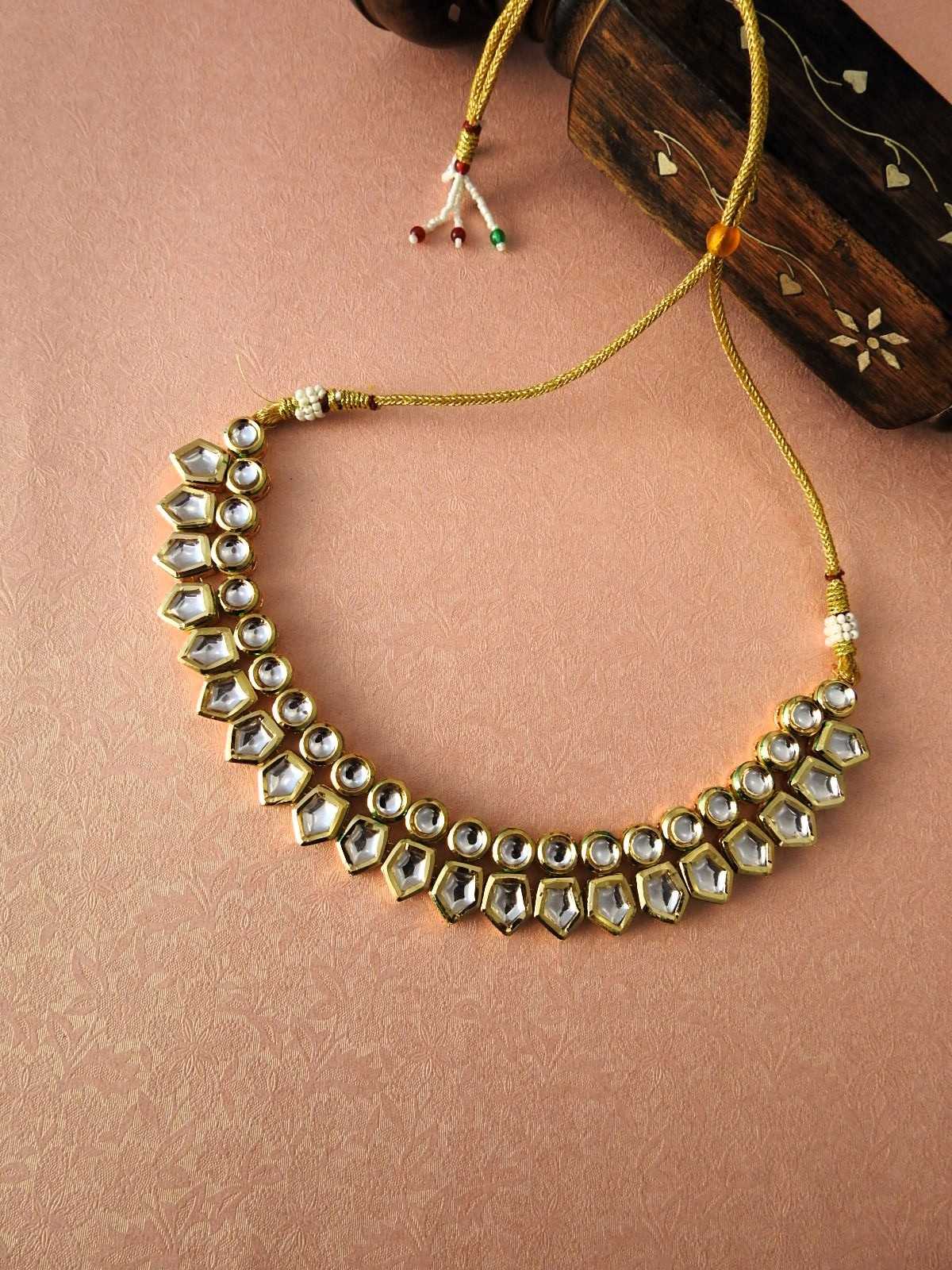 Elevate your ethnic charm with our Golden Radiance Kundan Necklace Set, a perfect blend of timeless elegance and royal craftsmanship. This exquisite set features a choker-style necklace adorned with high-quality mirror-finish Kundan stones set in a lustrous gold-tone base. The necklace is paired with matching stud earrings and a stunning maang tikka, completing your traditional look with a regal touch.
