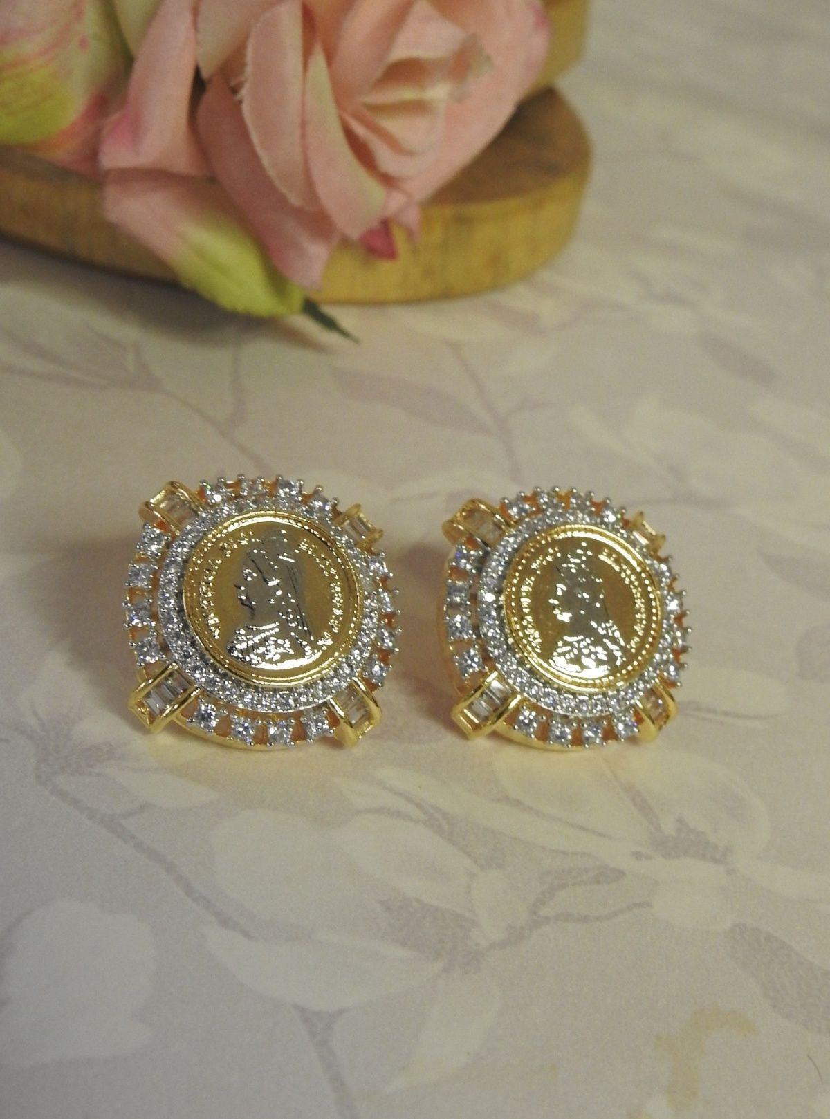Each piece features a finely detailed imperial coin surrounded by layers of shimmering CZ stones, creating a radiant statement of luxury and tradition. Perfect for festive occasions, weddings or elegant evening wear.