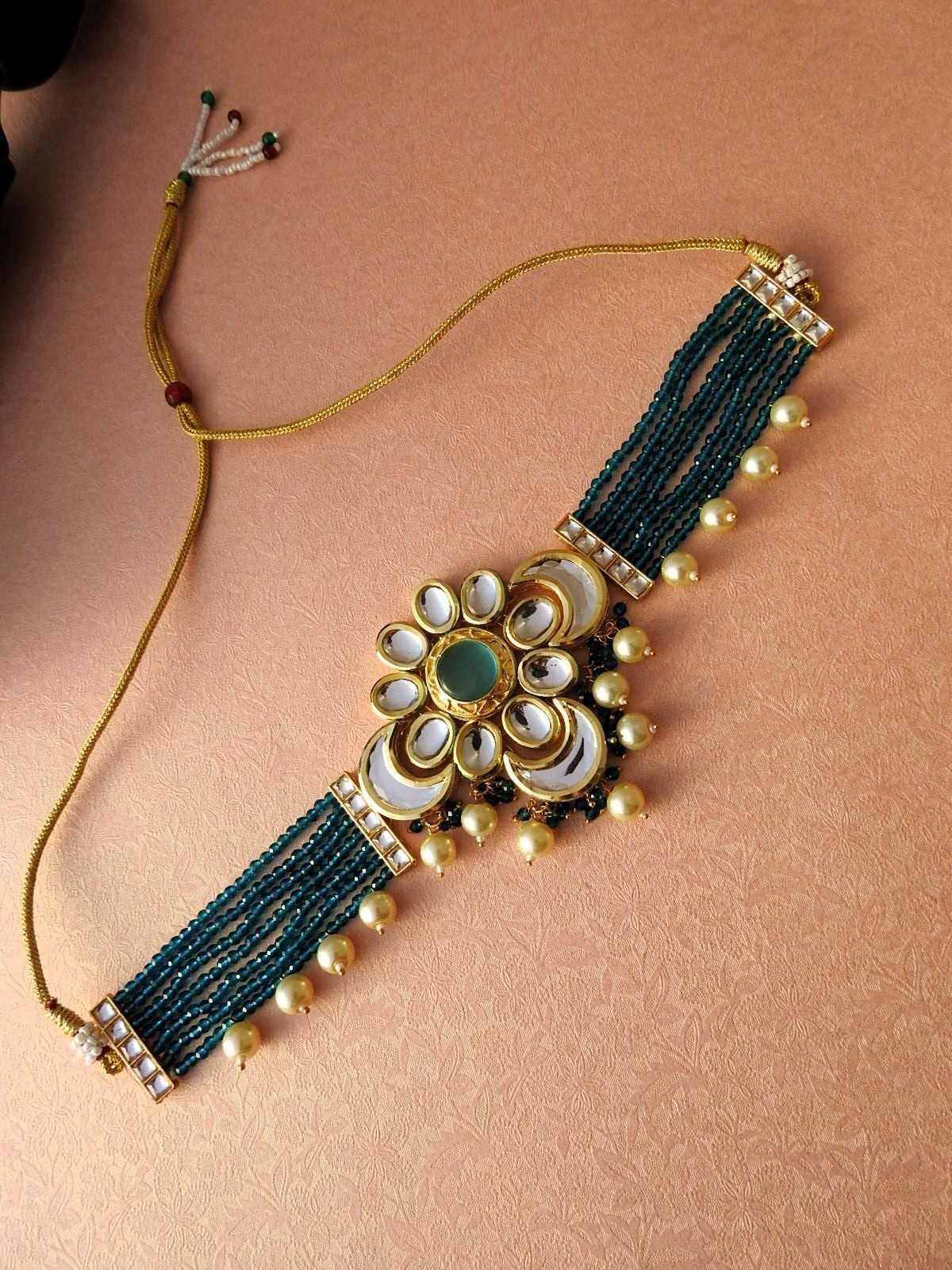 Channel graceful sophistication with the Ocean Bloom Beaded Choker Set, a stunning creation that merges timeless artistry with modern finesse. The choker features multiple strands of beads, beautifully contrasted by a radiant floral centerpiece adorned with Kundan, lustrous pearls, and delicate golden detailing.