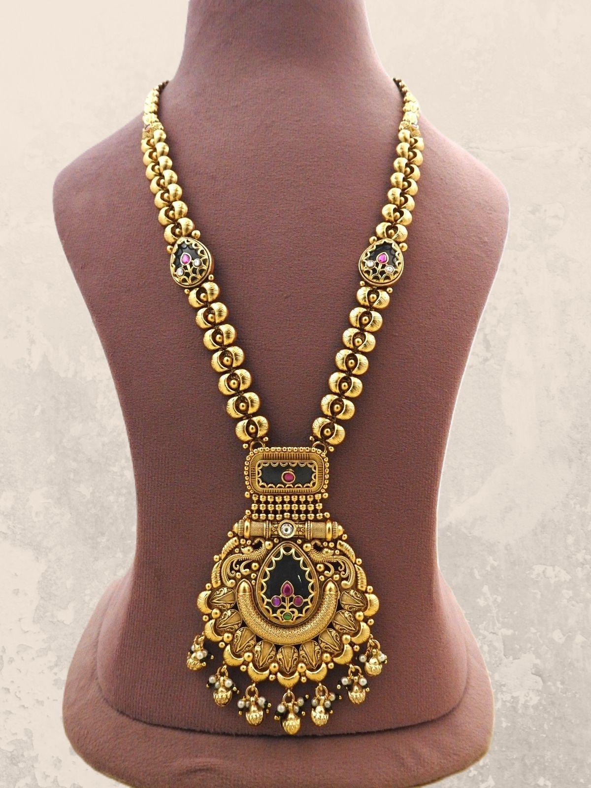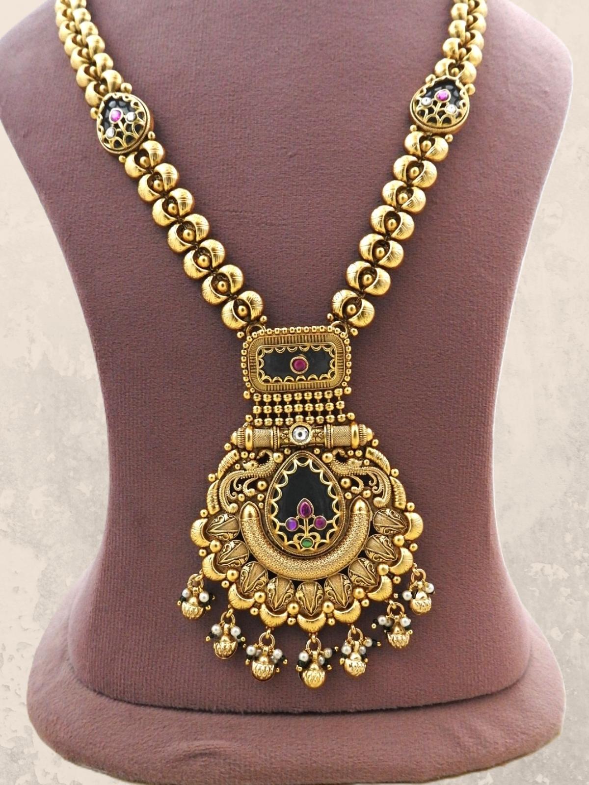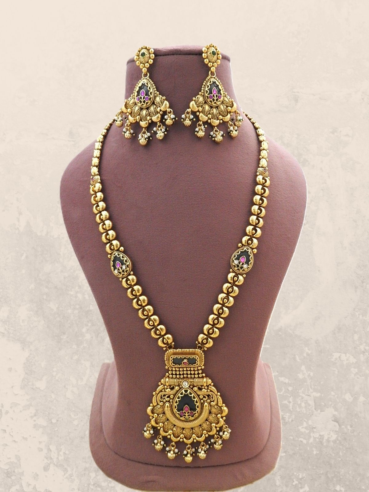 Finished in antique gold and detailed with subtle accents, this long necklace and matching earrings bring an elegant, graceful charm to sarees, lehengas and traditional ensembles. Perfect for weddings, festive celebrations and special occasions, this timeless design blends classic style with refined sophistication.